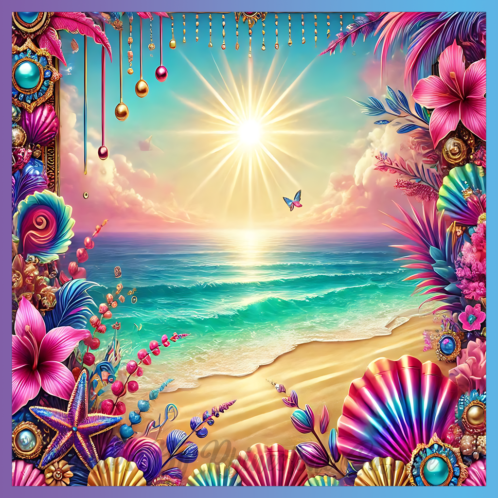 Theme: Beach with sun, ocean, sunset, flowers.