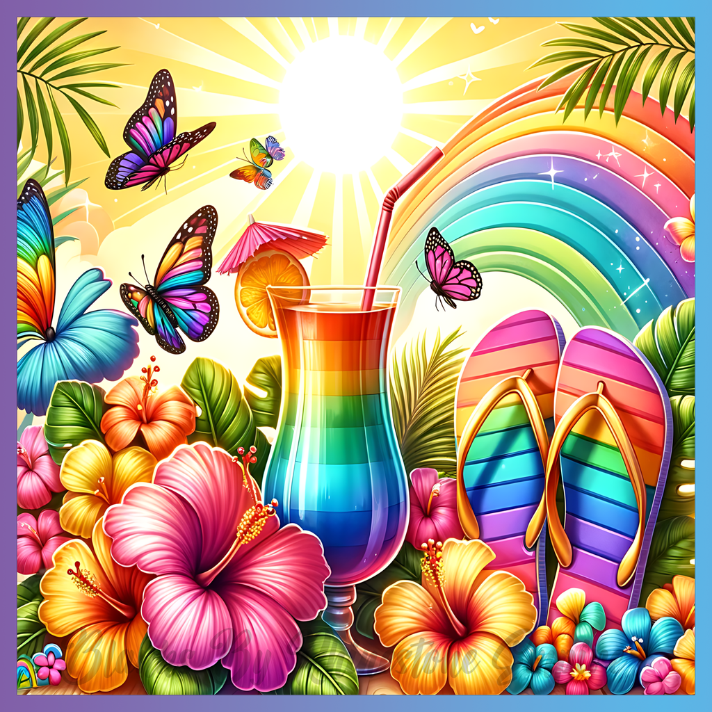 Theme: Drink with rainbow, butterflies, flowers, sun.