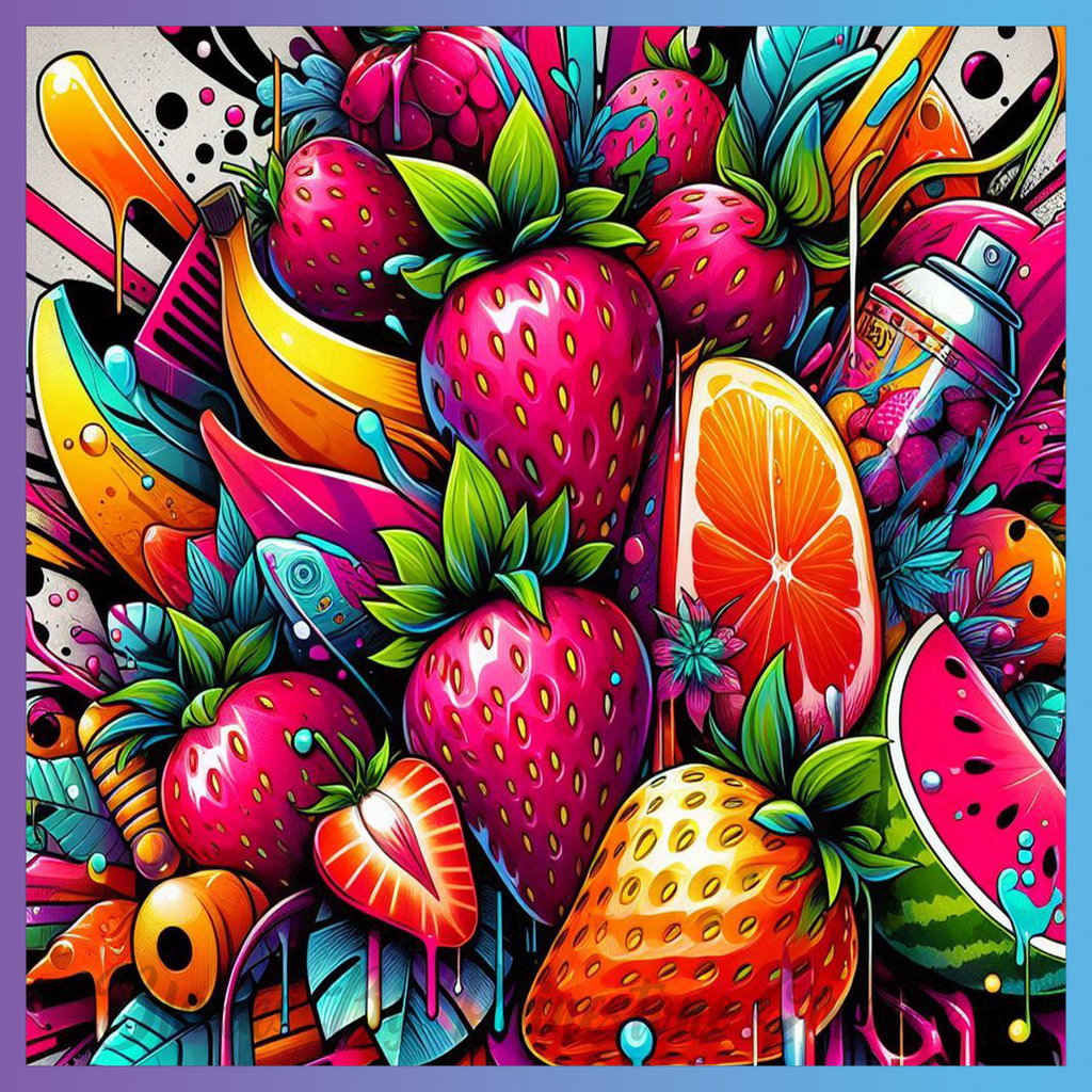 Theme: Fruit with strawberries, bananas, oranges, watermelon.