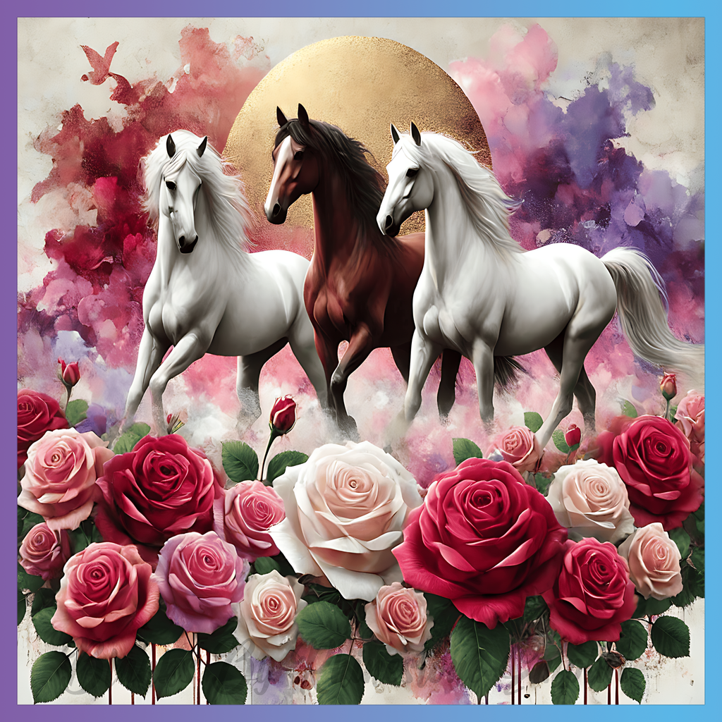 Theme: Horses with roses, flowers, background, colorful.