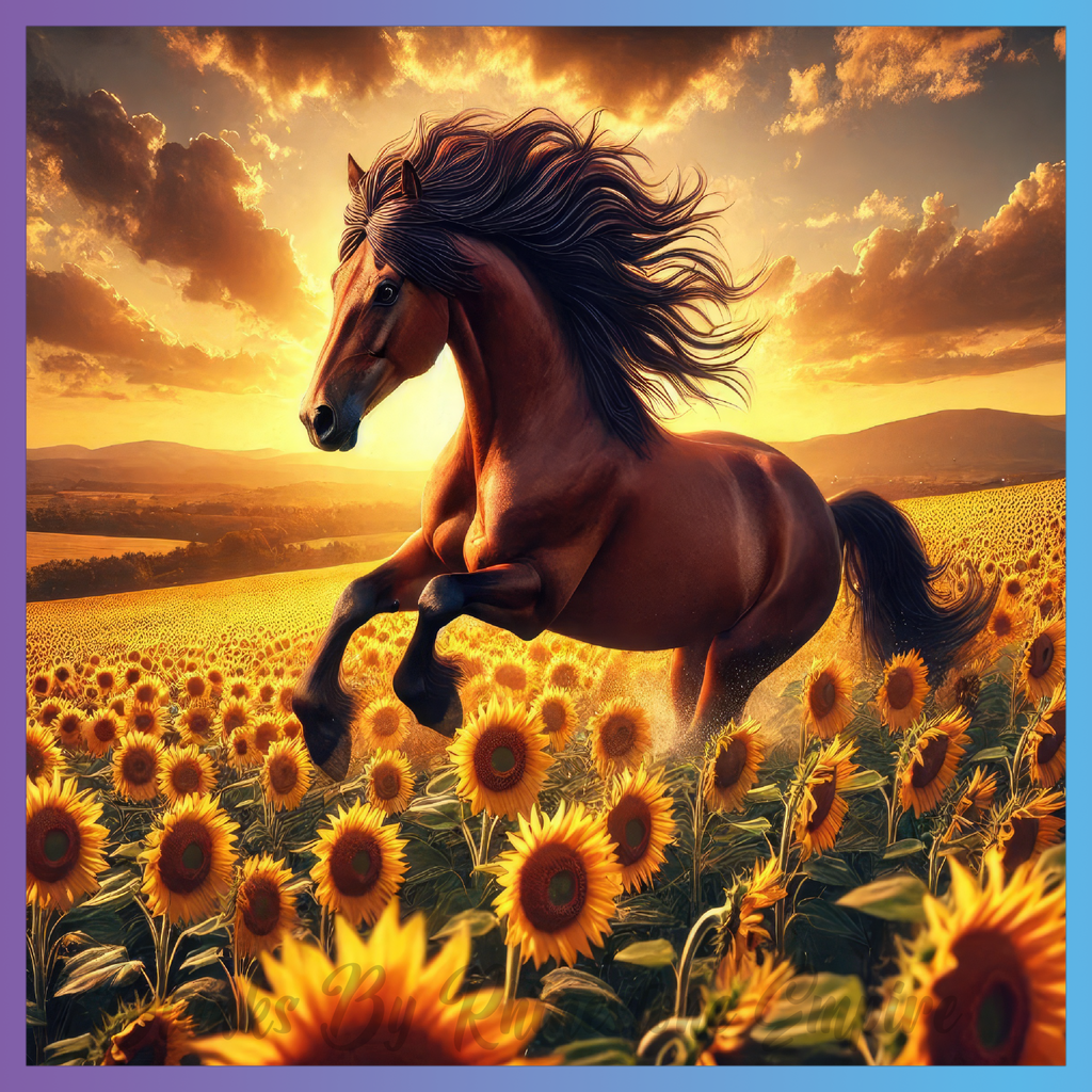 Theme: Horse with sunflowers, sunset, running, field.