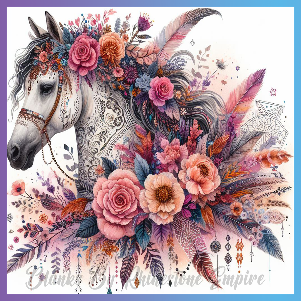 Theme: Horse with flowers, feathers, ornamental, vibrant.