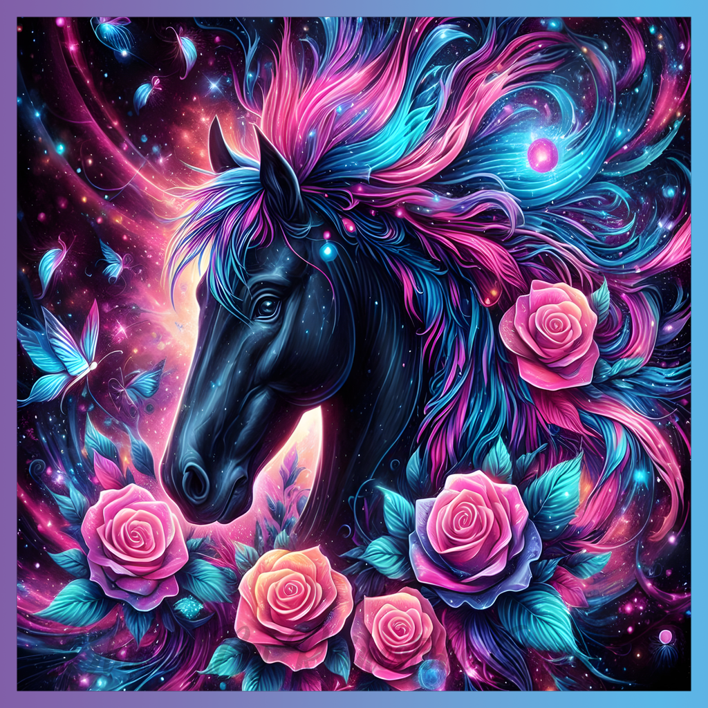 Theme: Horse with colorful, roses, butterflies, cosmic.