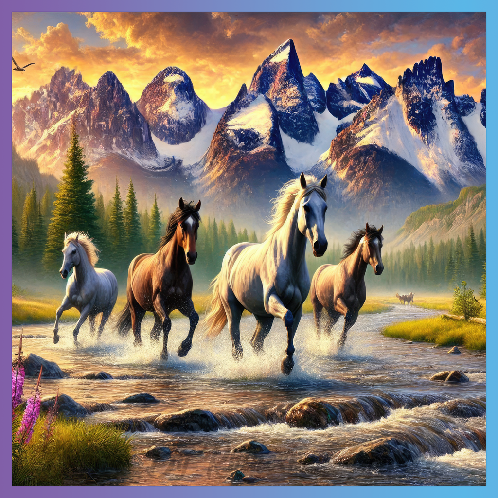 Theme: Horse with running, mountains, river, sunset.