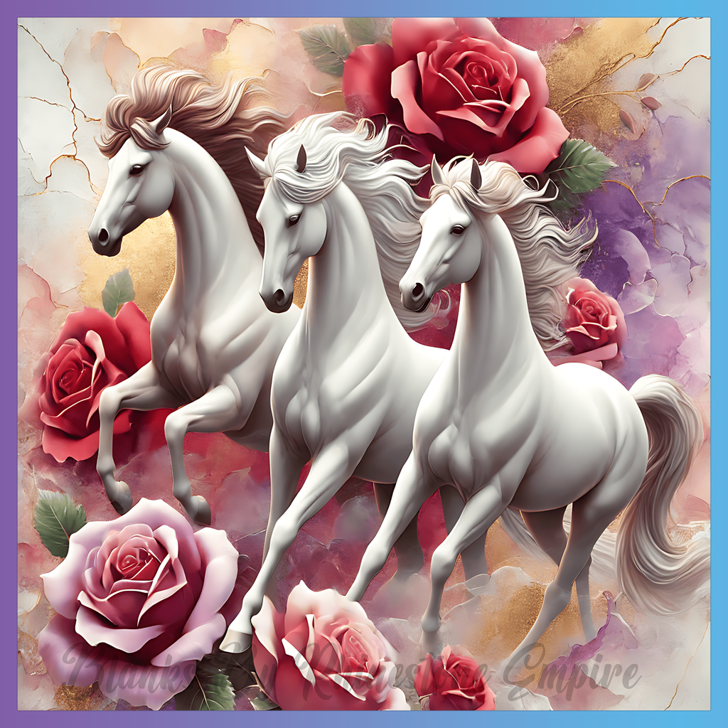 Theme: Horse with white, roses, flowers, galloping.