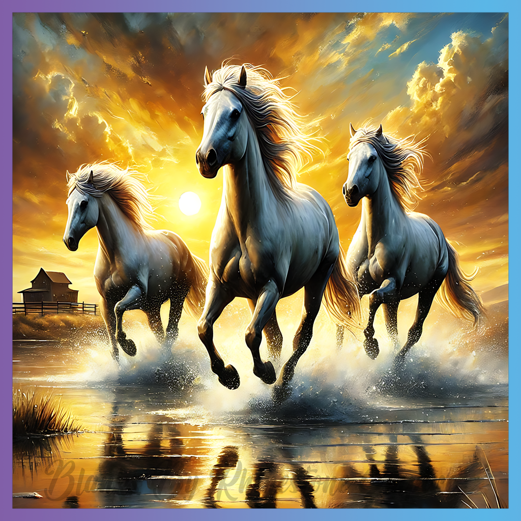 Theme: Horse with sunset, running, water, clouds.