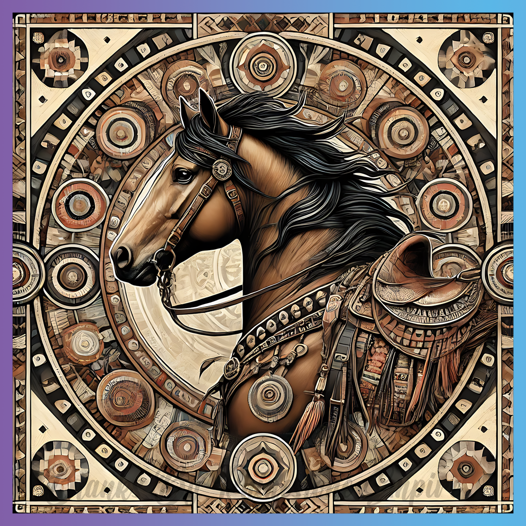 Theme: Horse with saddle, ornate, circular, decorative.