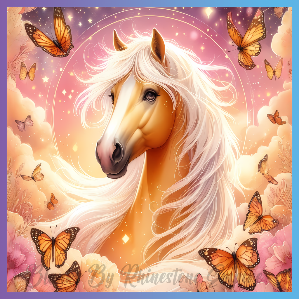 Theme: Horse with butterflies, flowers, pastel, whimsical.