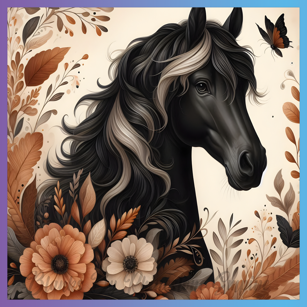 Theme: Horse with black, flowers, butterfly, leaves.