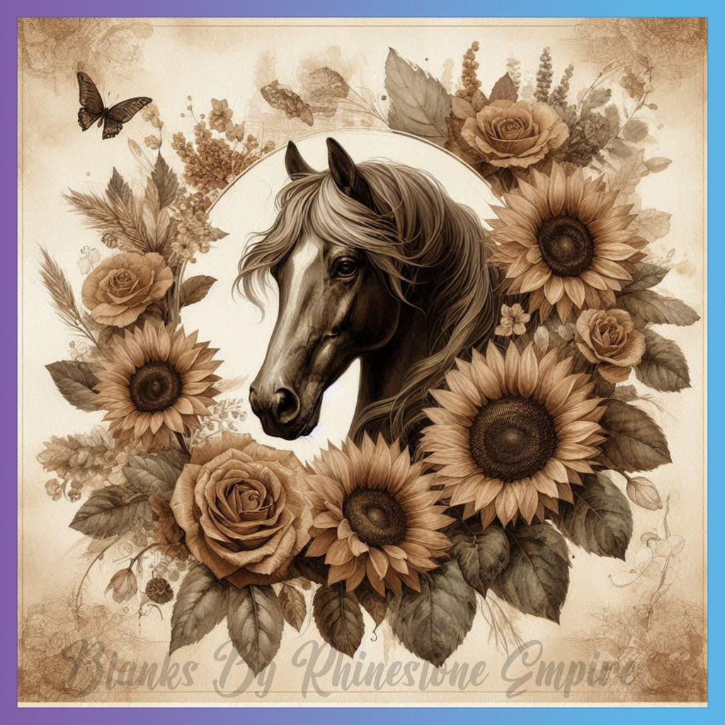 Theme: Horse with flowers, sunflowers, roses, butterfly.