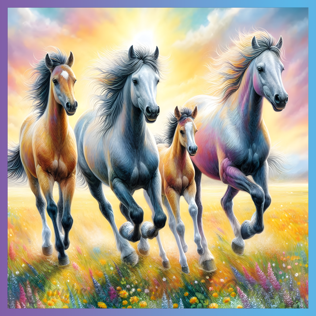 Theme: Horse with running, sunset, field, flowers.