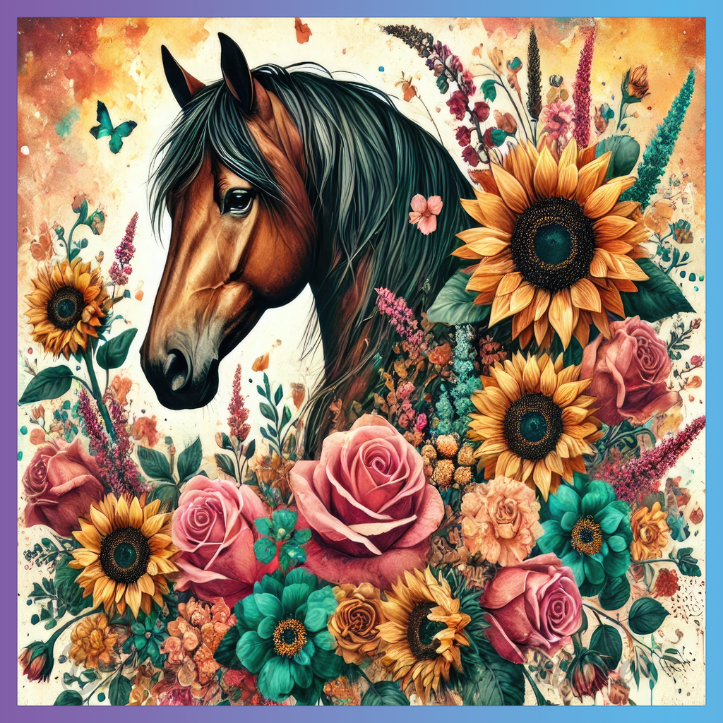Theme: Horse with flowers, sunflowers, roses, butterfly.