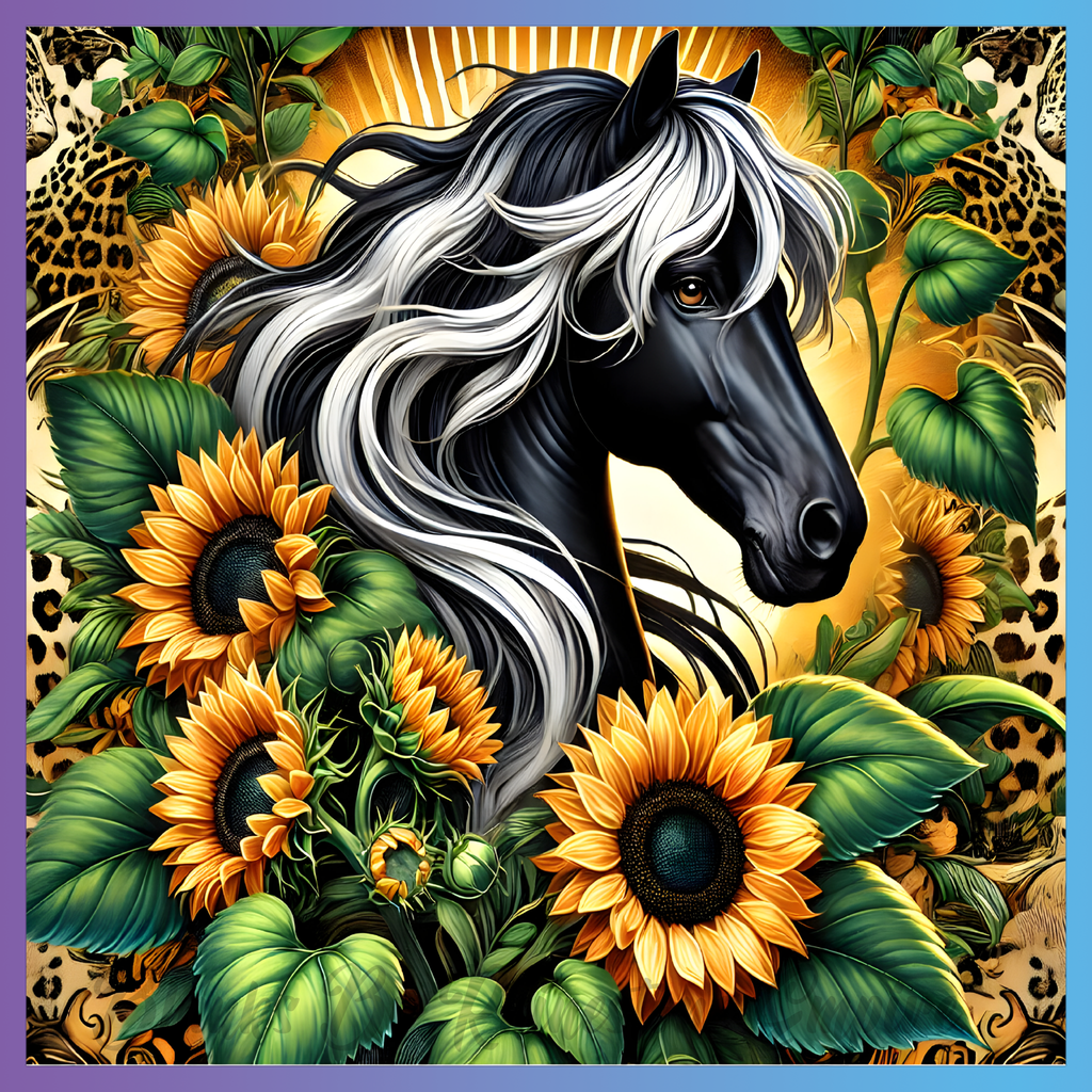 Theme: Horse with black, sunflowers, leaves, golden.