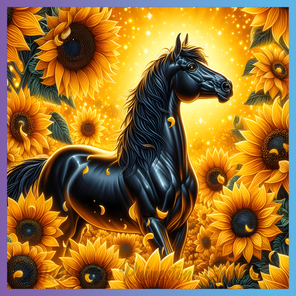 Theme: Horse with black, sunflowers, golden, flowers.