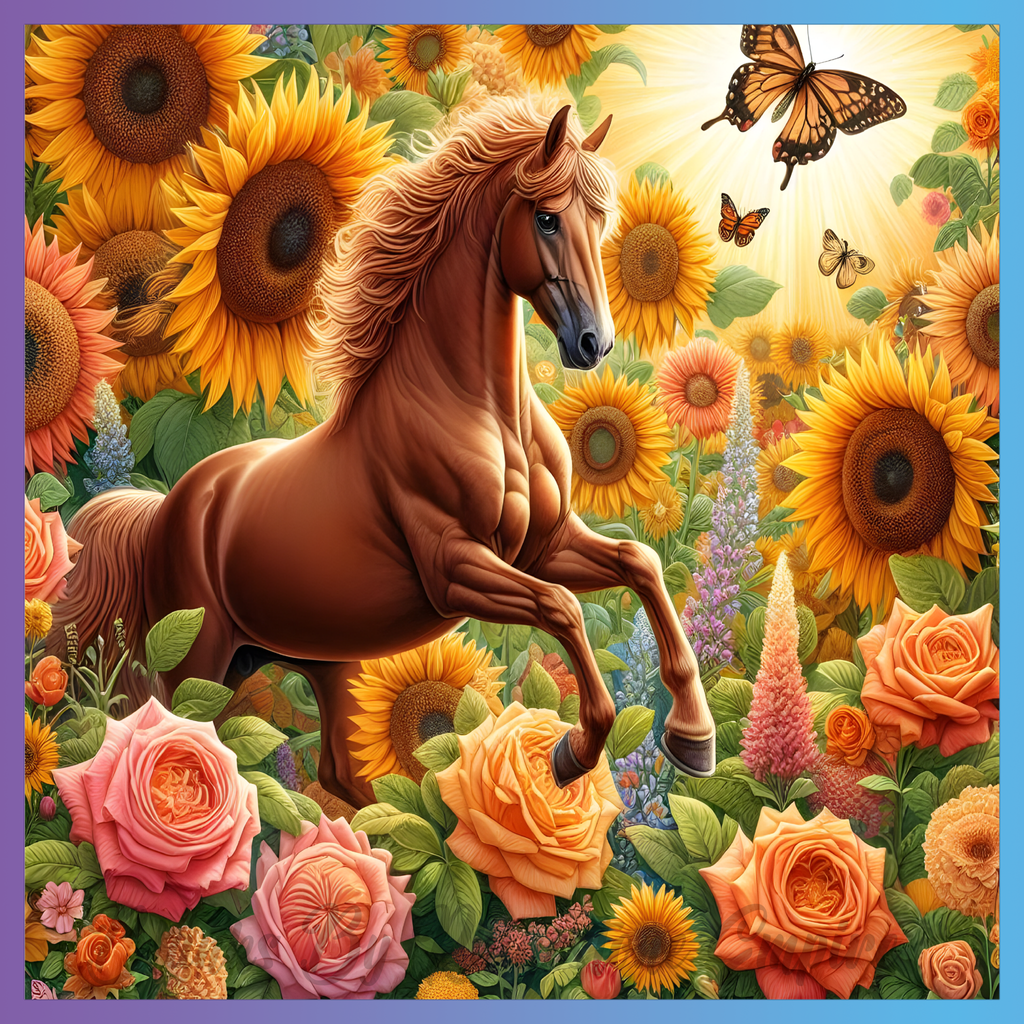 Theme: Horse with sunflowers, roses, butterflies, flowers.