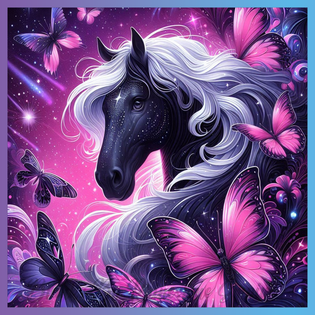Theme: Horse with butterflies, purple, stars, fantasy.