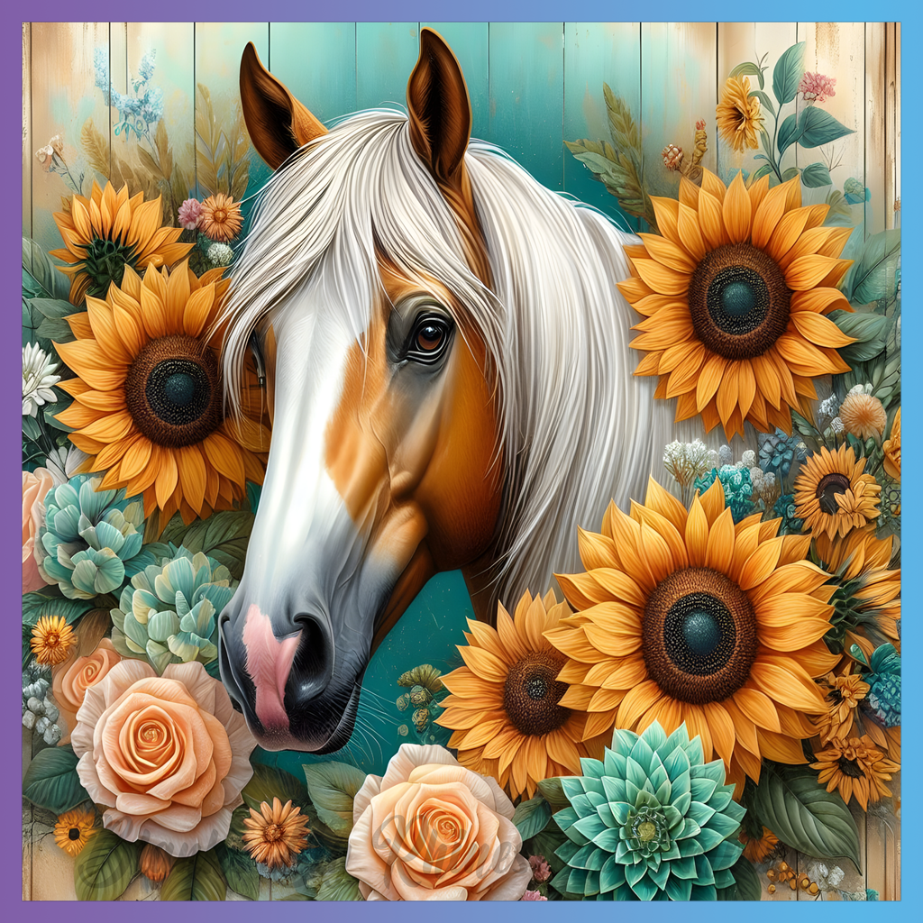 Theme: Horse with flowers, sunflowers, roses, succulents.
