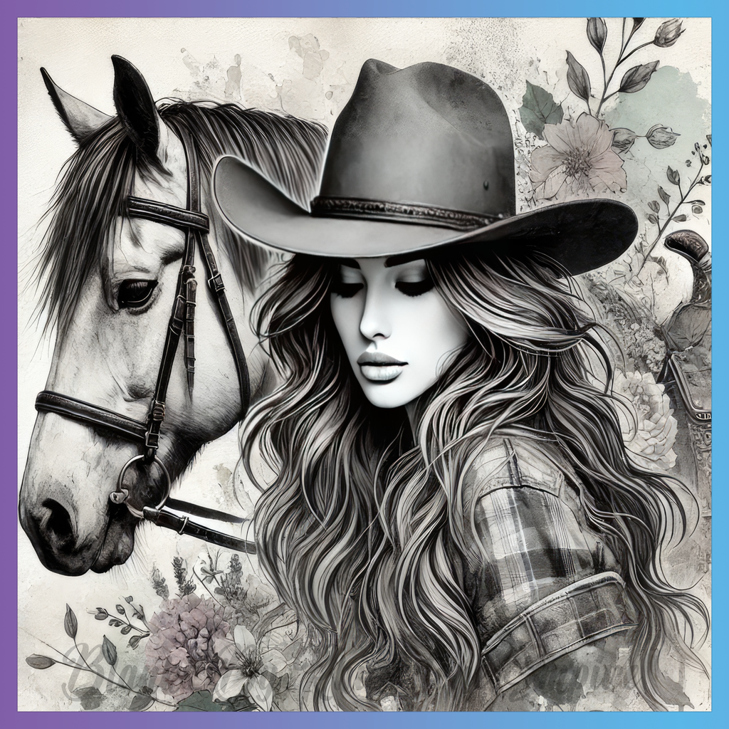 Theme: Girl with horse, hat, flowers, portrait.
