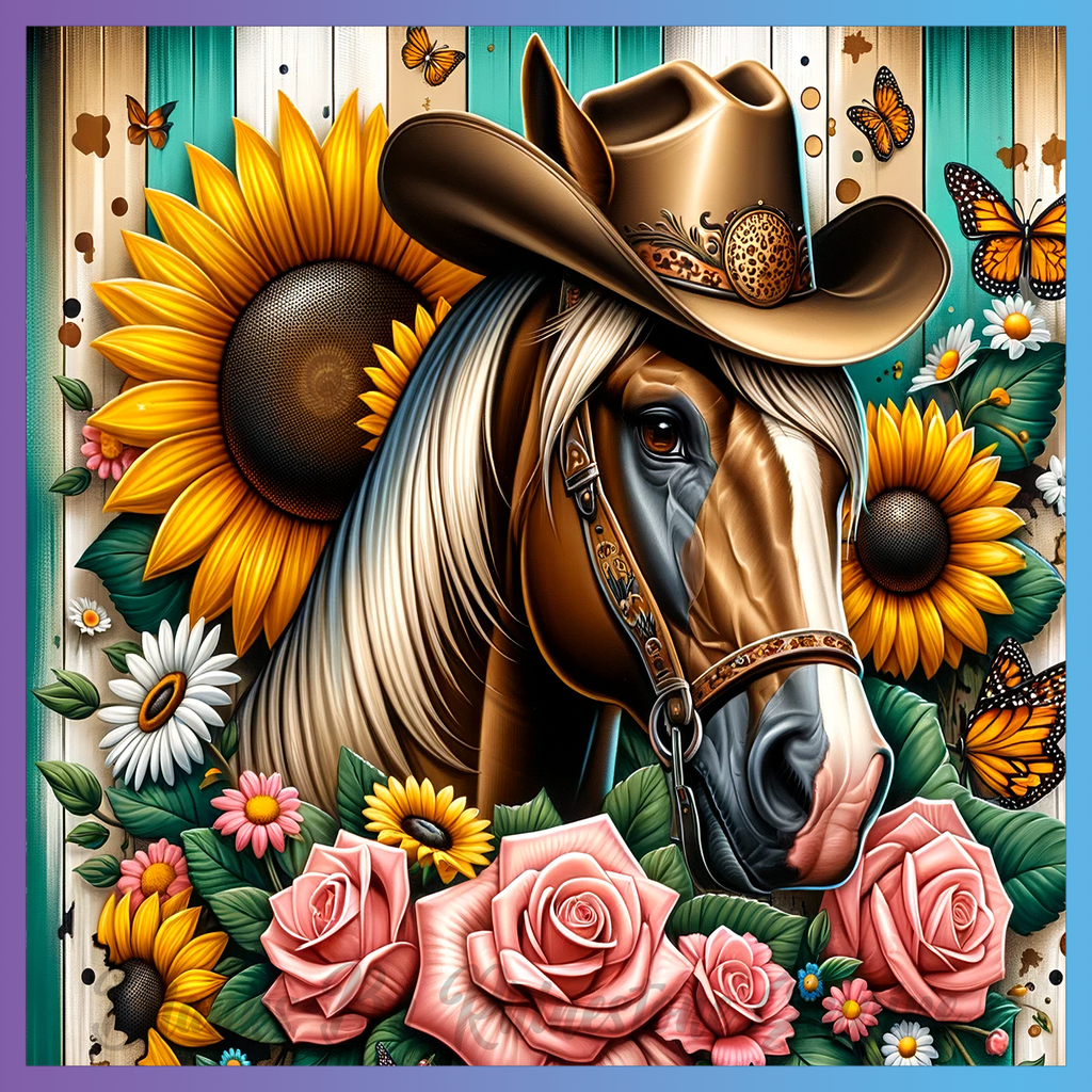 Theme: Horse with cowboy, sunflowers, roses, butterflies.