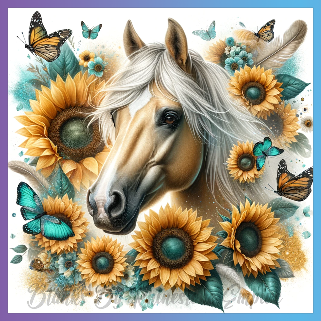 Theme: Horse with sunflowers, butterflies, flowers, colorful.