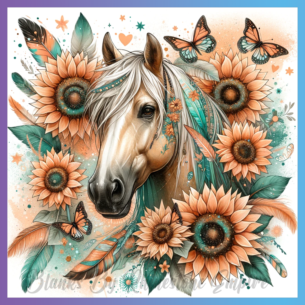 Theme: Horse with sunflowers, butterflies, feathers, flowers.