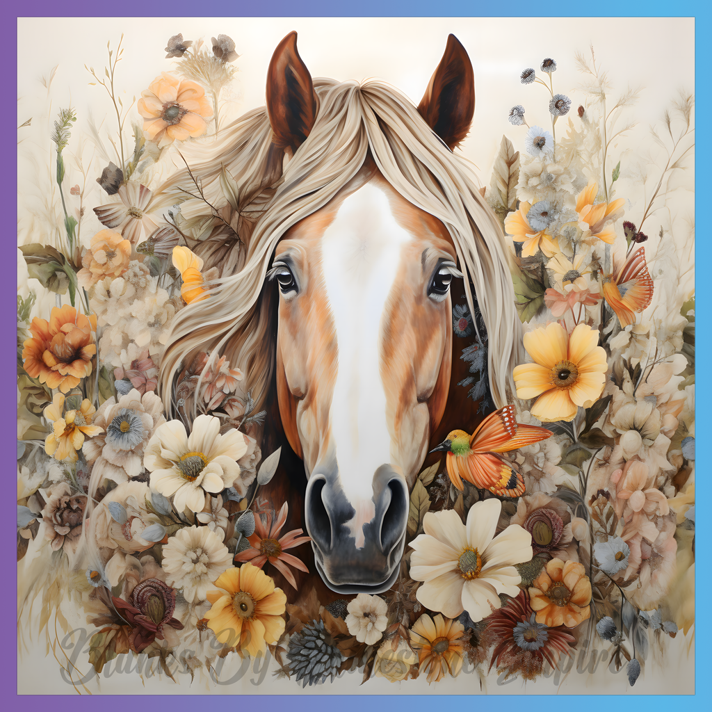 Theme: Horse with flowers, butterflies, portrait, nature.