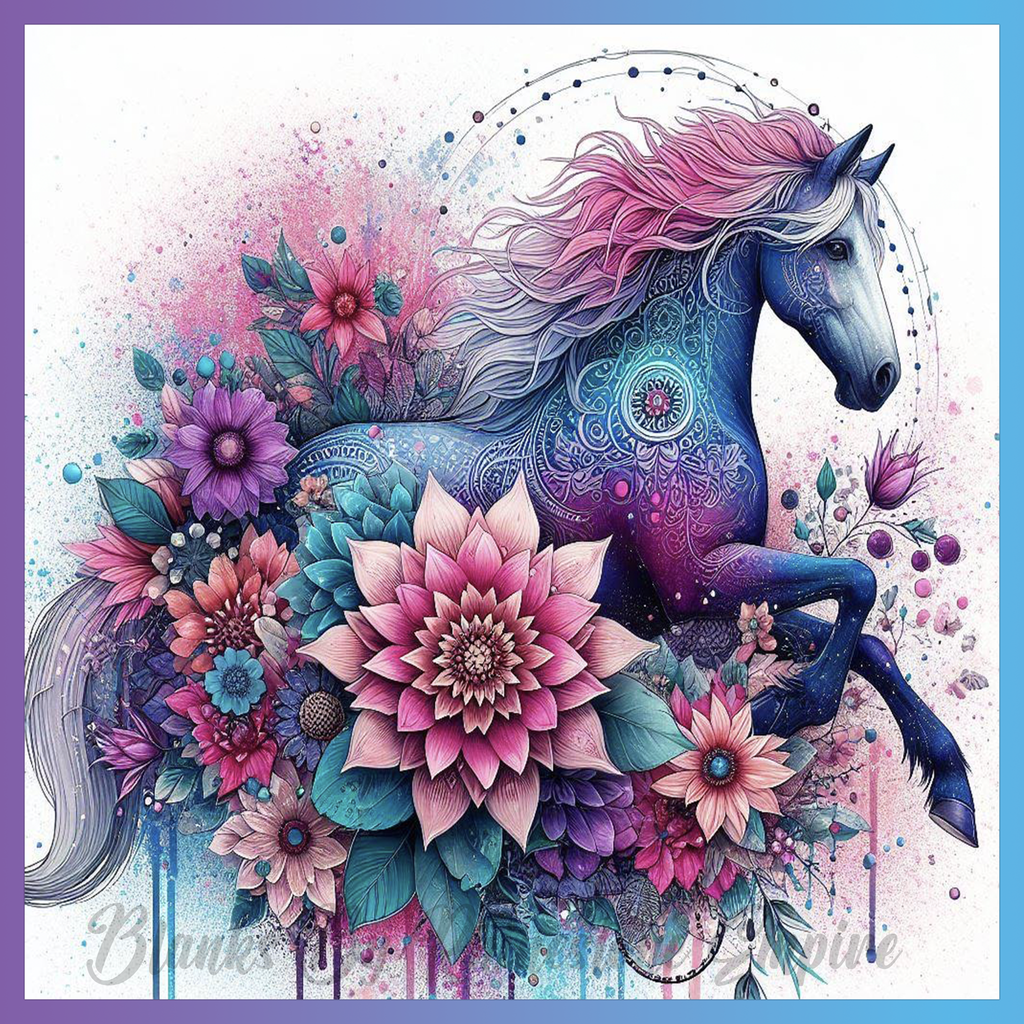 Theme: Horse with flowers, colorful, fantasy, swirls.