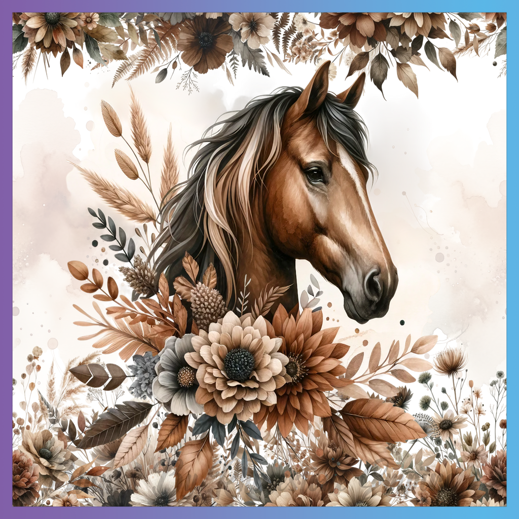 Theme: Horse with flowers, floral, brown, nature.