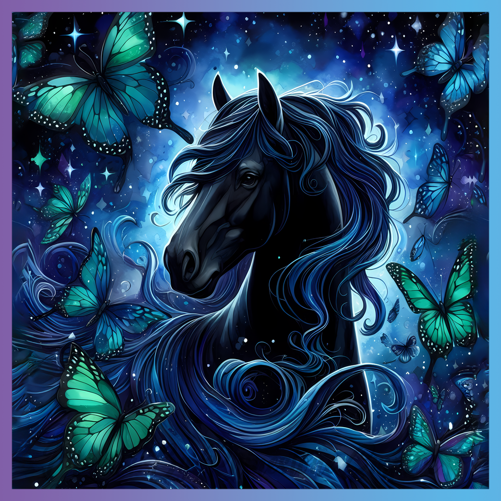 Theme: Horse with butterflies, blue, swirls, stars.