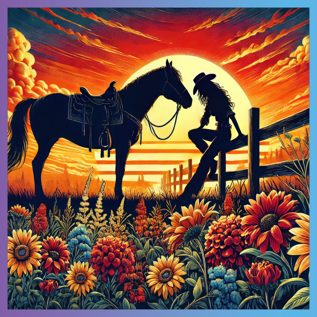 Theme: Horse with cowgirl, sunset, flowers, fence.