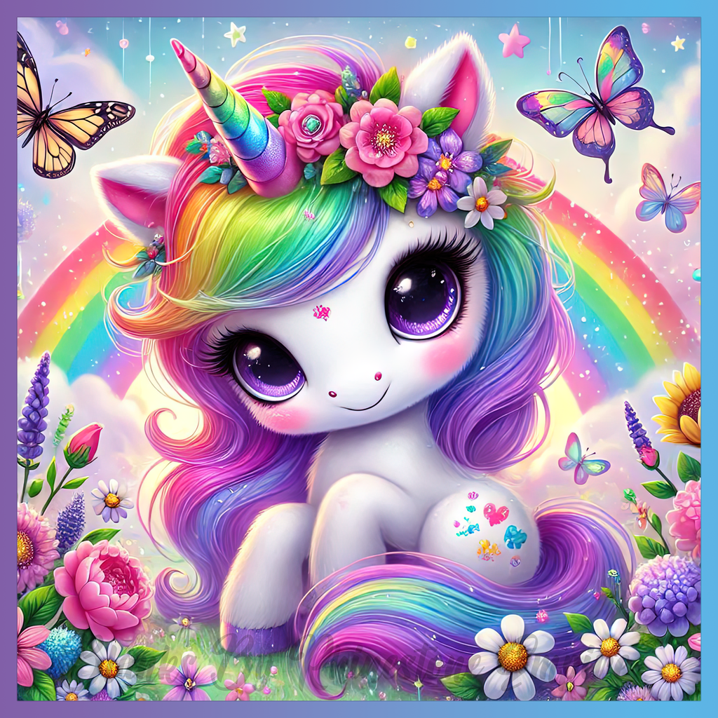 Theme: Unicorn with rainbow, flowers, butterflies, pastel.