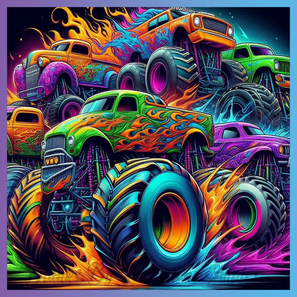 Theme: Truck with monster, colorful, flames, vibrant.