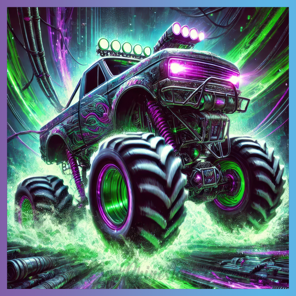 Theme: Truck with monster, neon, vibrant, mechanical.