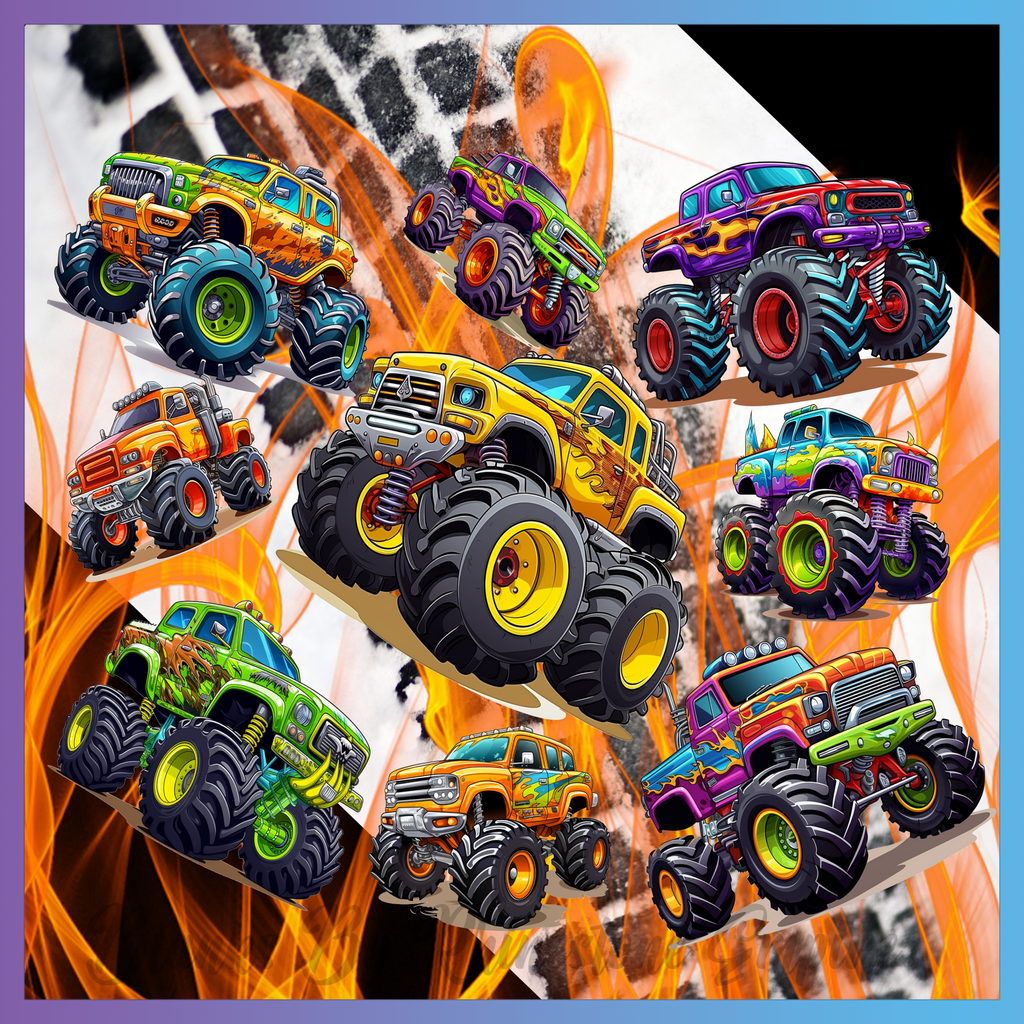 Theme: Truck with monster, colorful, flames, background.