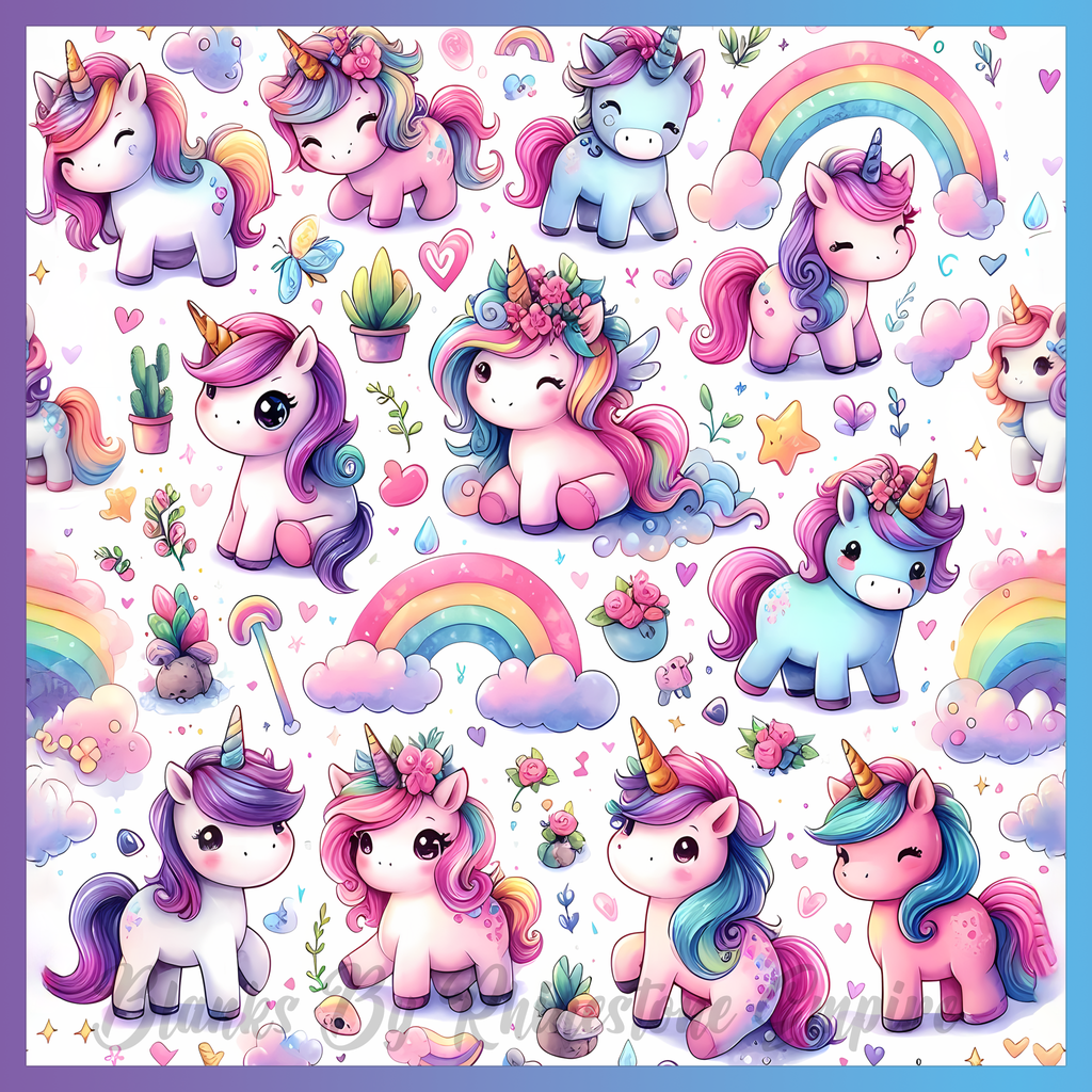 Theme: Unicorn with cute, colorful, rainbows, clouds.