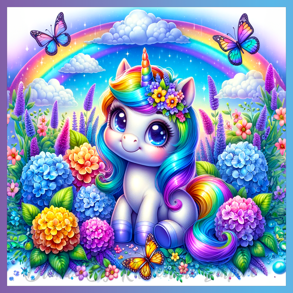 Theme: Unicorn with flowers, butterflies, rainbow, colorful.