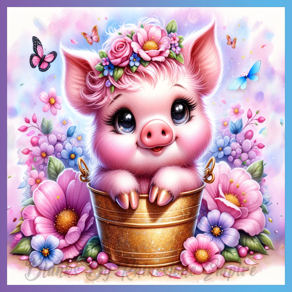 Theme: Pig with flowers, bucket, butterflies, cute.