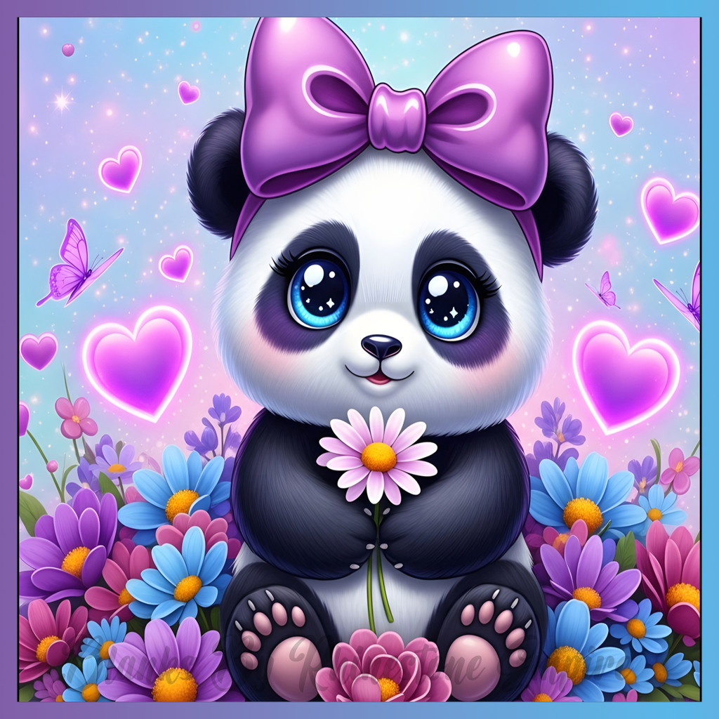 Theme: Panda with cute, flowers, bow, hearts.