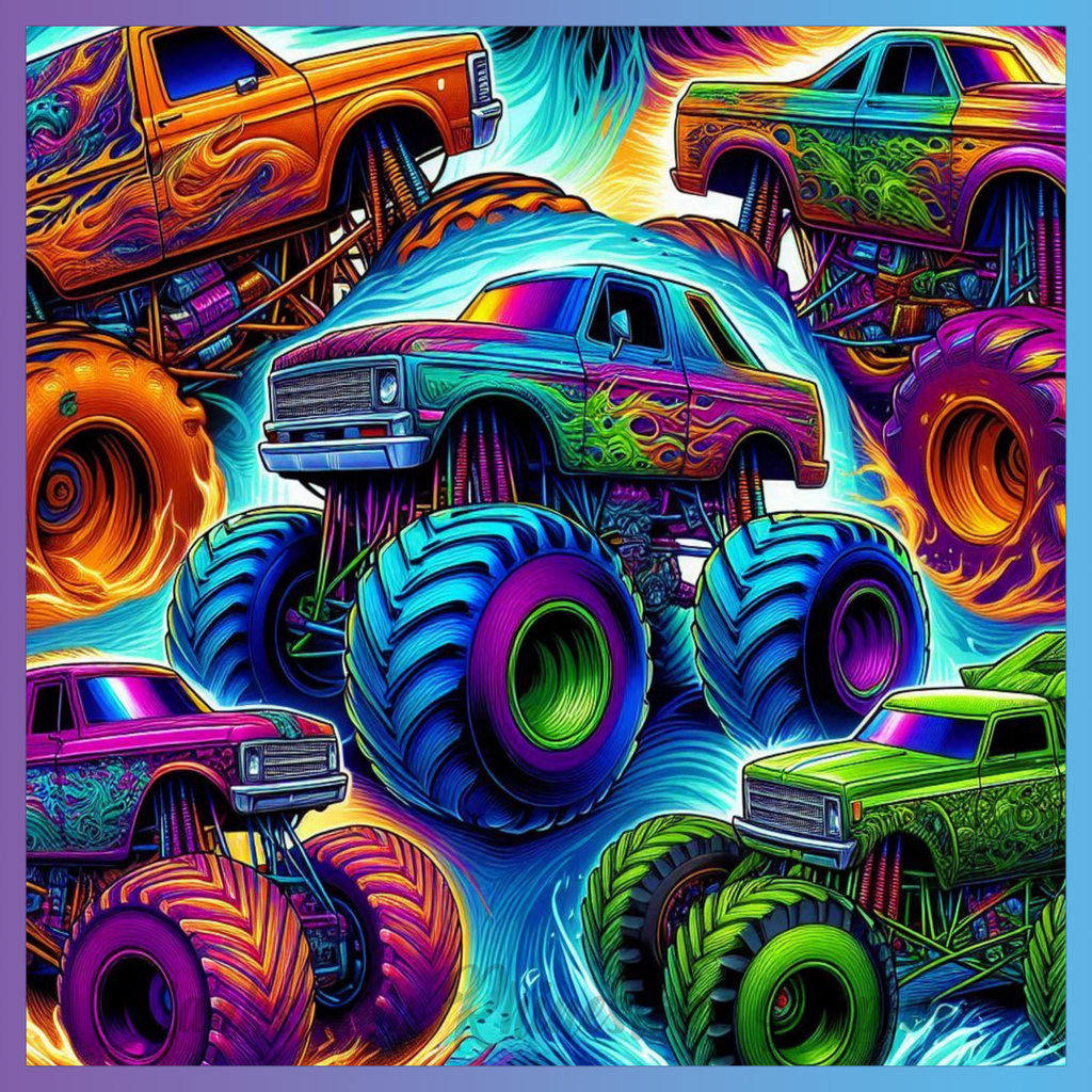Theme: Truck with monster, colorful, vibrant, wheels.