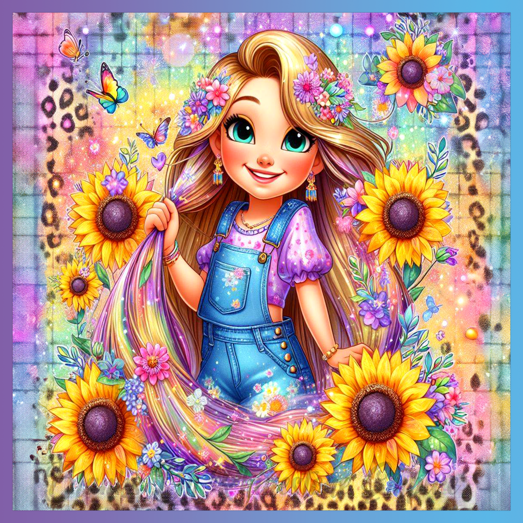 Theme: Girl with flowers, sunflowers, butterflies, colorful.