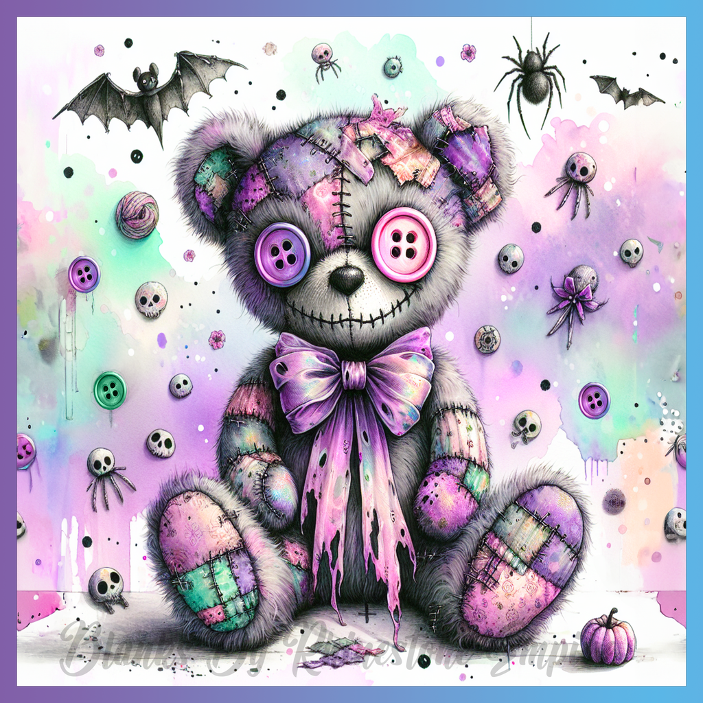 Theme: Teddy with patchwork, colorful, spooky, buttons.
