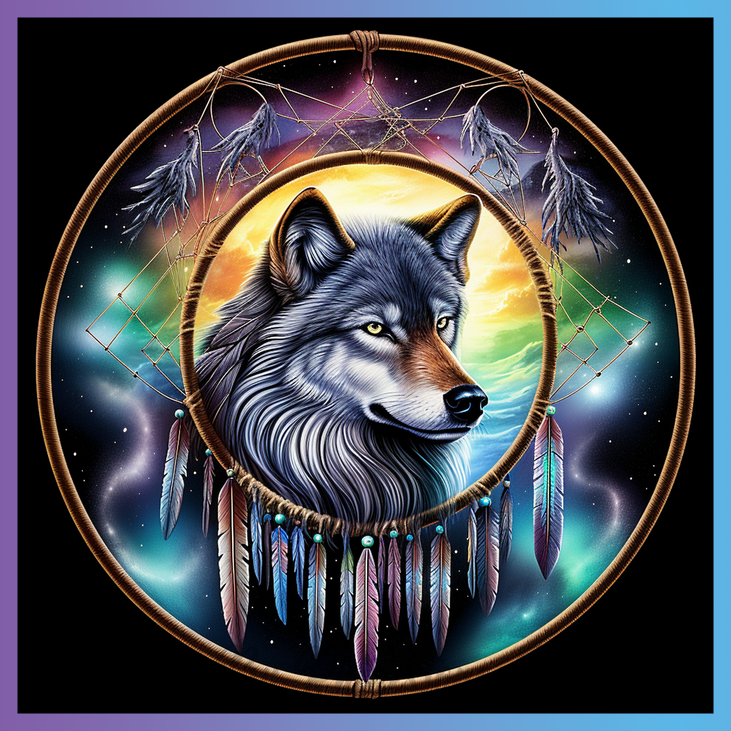Theme: Wolf with dreamcatcher, feathers, galaxy, colorful.