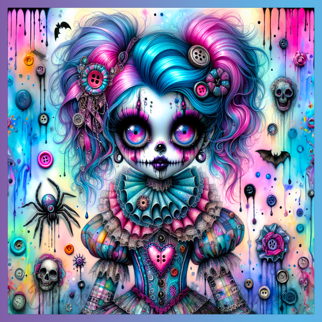 Theme: Girl with clown, colorful, buttons, skulls.