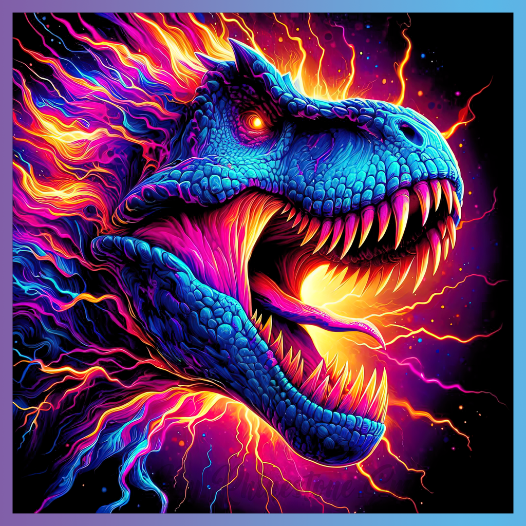 Theme: Dinosaur with colorful, electric, vibrant, head.