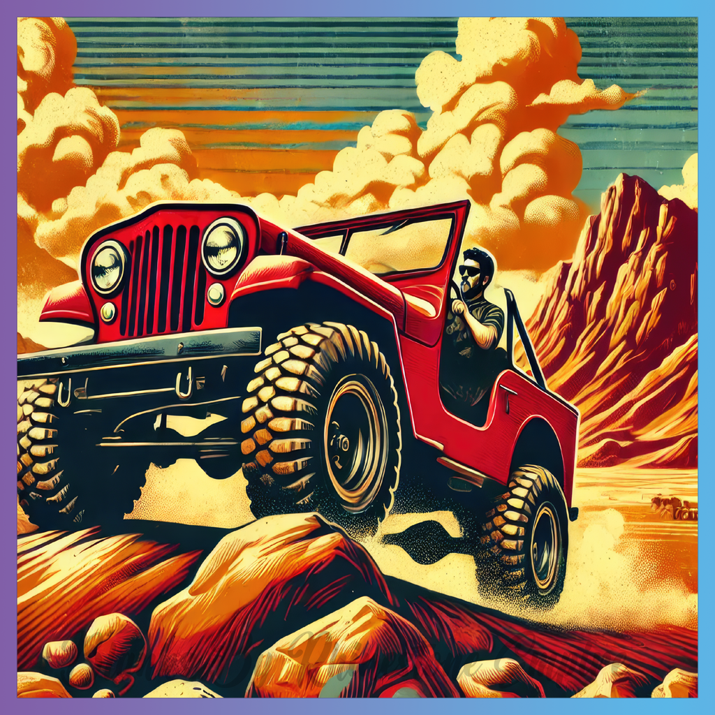 Theme: Jeep with off-road, mountains, desert, clouds.