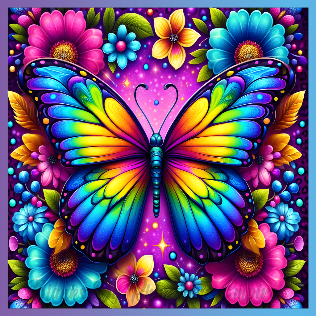 Theme: Butterfly with colorful, flowers, pattern, vibrant.