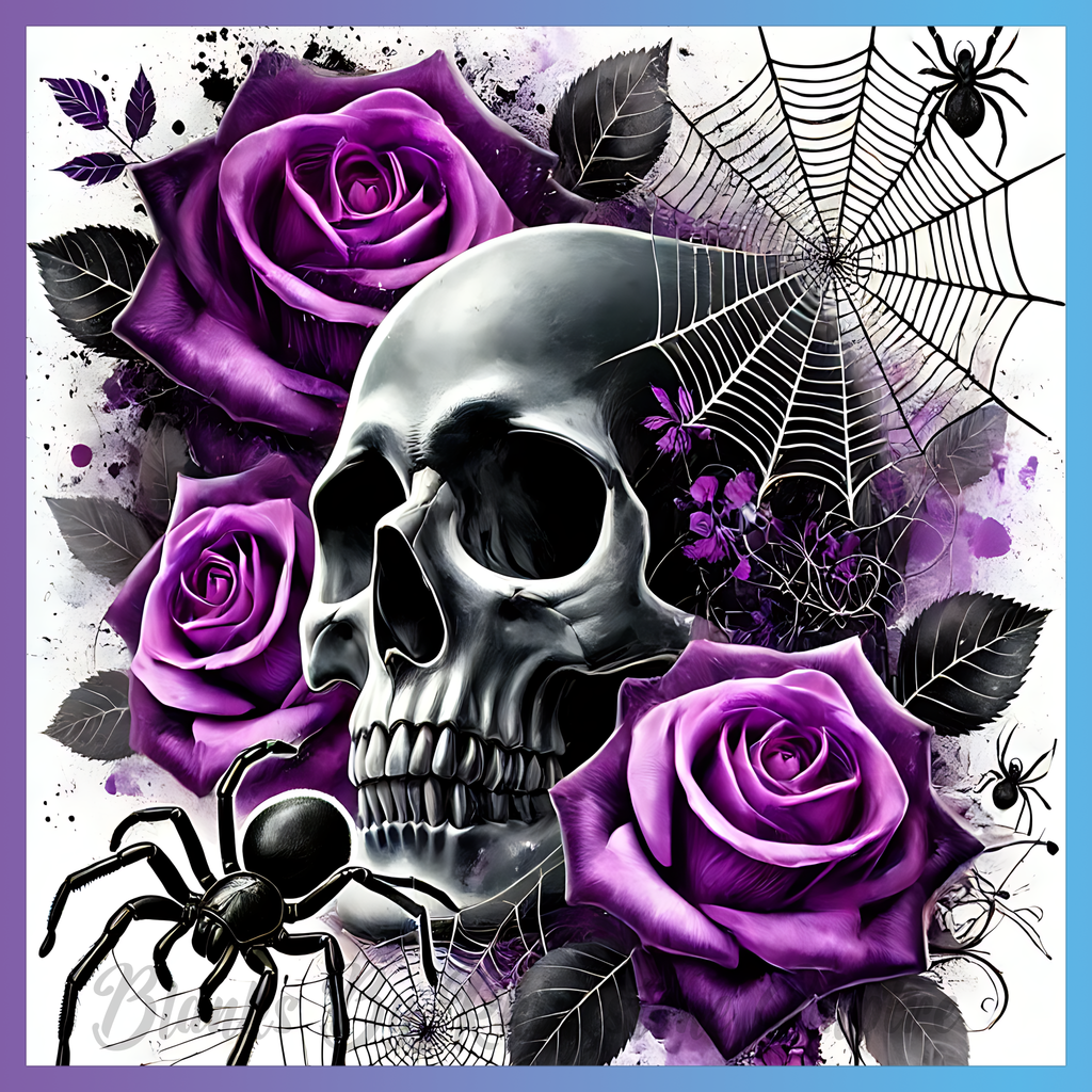 Theme: Skull with roses, purple, spider, web.