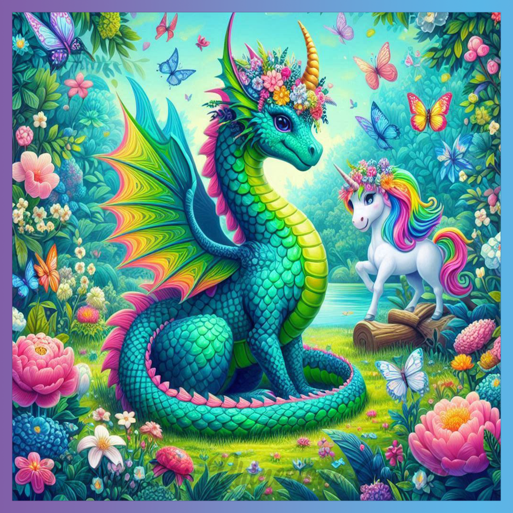 Theme: Dragon with unicorn, flowers, butterflies, forest.
