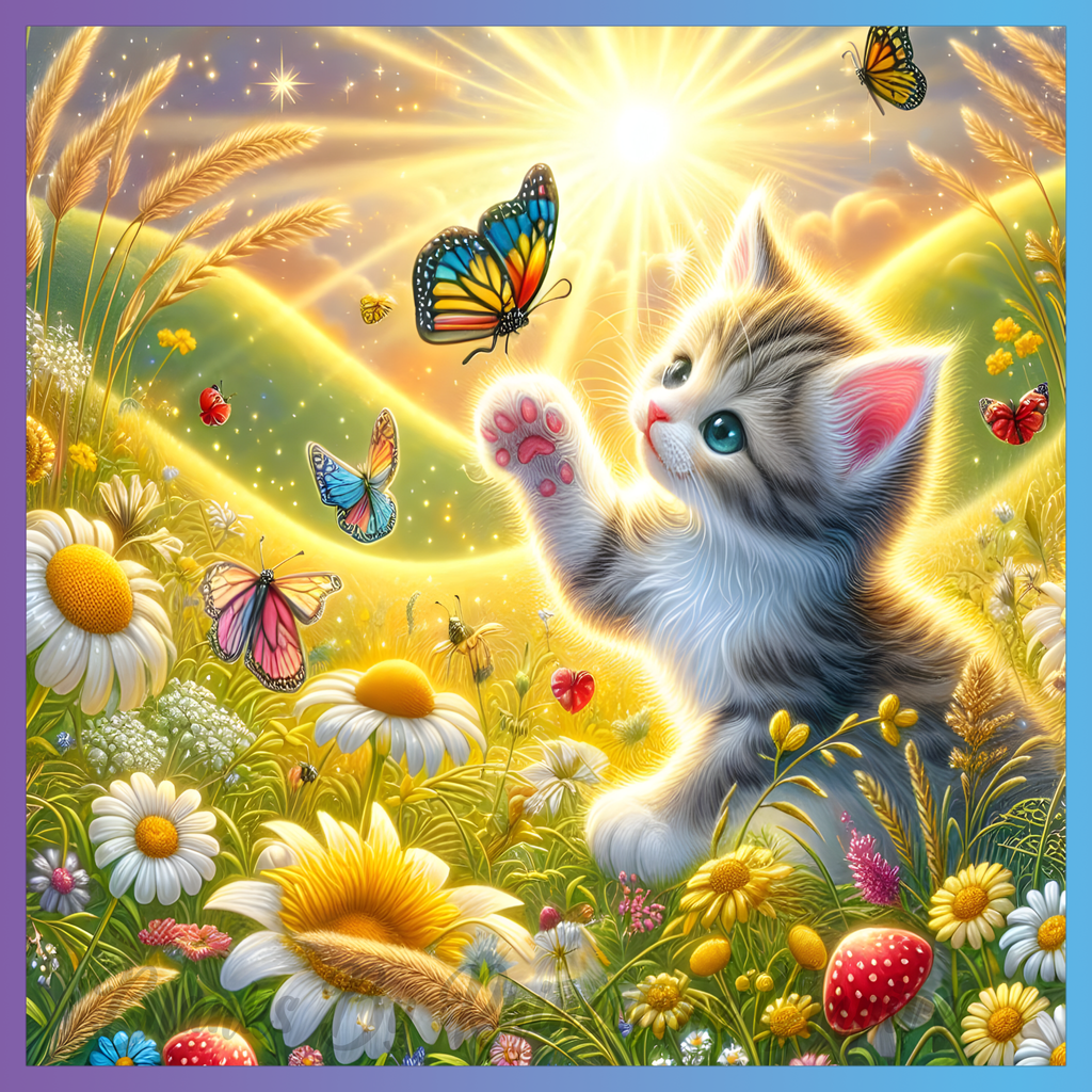 Theme: Kitten with butterflies, flowers, sunlight, meadow.