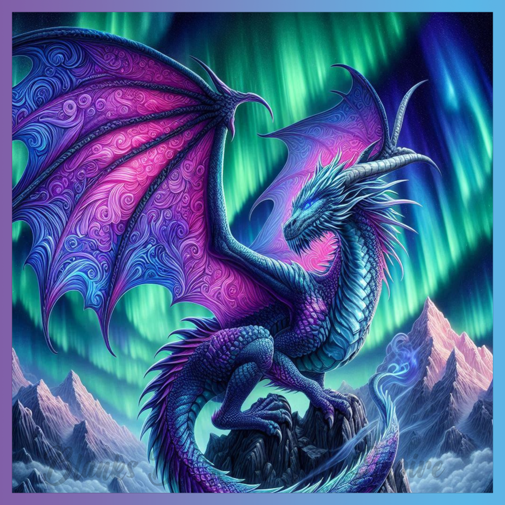 Theme: Dragon with fantasy, aurora, mountains, colorful.